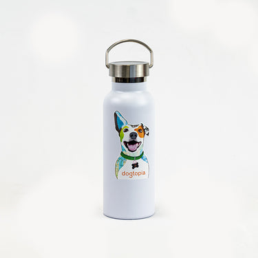 Be seen carrying the coolest water bottle from Dogtopia – the ultimate companion for your hydration needs. Crafted from premium stainless steel, this water bottle ensures durability and a sleek, modern look. The pristine white color adds a touch of elegance, making it a perfect accessory for any occasion. Choose from one of two secure handle caps, either a handle or screw top, making it easy to carry wherever you go. With a size of 17 ounces, it strikes the perfect balance between portability and capacity. Whether you're hitting the gym, hiking, or running errands, this water bottle will keep you hydrated and looking chic. Embrace a healthier lifestyle with the 17-ounce, Stainless Steel Dogtopia Water Bottle – where functionality meets fashion.